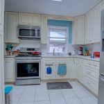 kitchen with ceramic tile floor, cabinets, sink, recycled glass counter tops, stainless appliances. Bathroom also