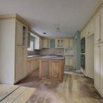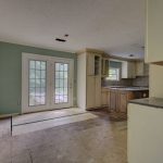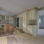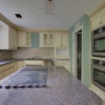 countertop, stainless steel double oven, and antique white cabinetry, just needs finishing touches.